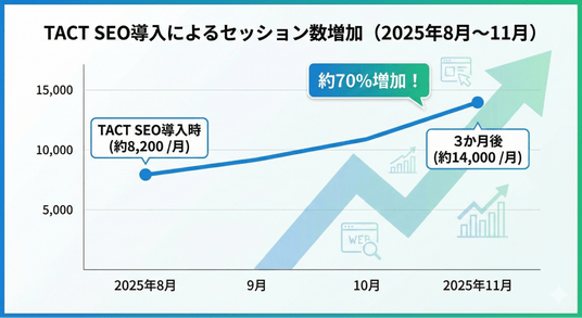 YC GROUPが運営する女性向けライフスタイルメディア「ハナサチ」では、サイト開設後、SEO記事の作成や運用に関するノウハウが不足しており、集客効果を最大化するための体制構築が急務となっていました。そこで、2025年夏より「TACT SEO」を導入し、ツールによる分析とサポートを通じたSEO施策を開始。その結果、施策開始から3ヶ月間でセッション数が約1.7倍に増加し、新規作成した記事の約6割が検索順位トップ10以内にランクインするなど、短期間で顕著な成果を達成されました。