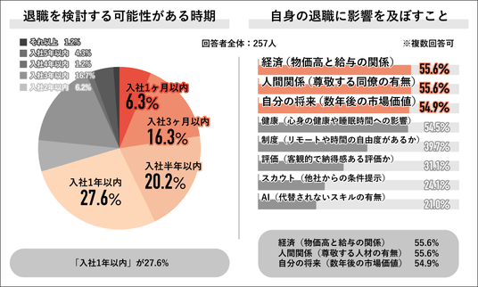 回答者全体の257人に退職を検討する可能性がある時期について聞くと、「入社1年以内」が27.6%で最多となり、次いで「入社半年以内」20.2%、「入社3ヶ月以内」が16.3%となりました。また、自身の退職に影響を及ぼすことを聞くと、「経済(物価高と給与の関係)」「人間関係(尊敬する同僚の有無)」が同率で55.6%となり、次いで「自分の将来(数年後の市場価値)」が54.9%となりました。