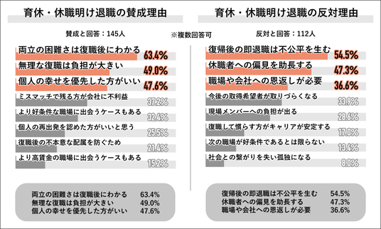 育休・休職明けの退職に賛成と回答した145人にその理由を聞くと、「両立の困難さは復職後にわかる」が63.4%で最多となり、次いで「無理な復職は負担が大きい」が49.0%、「個人の幸せを優先した方がいい」が47.6%となりました。一方で反対と回答した112人に、その理由を聞くと、「復帰後の即退職は不公平を生む」が54.5%で最多となり、次いで「休職者への偏見を助長する」が47.3%、「職場や会社への恩返しが必要」が36.6%となりました。