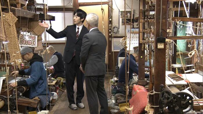 職人の機織りの様子をご覧になった悠仁さま。「これは、創業当時から同じ形ですか?」「この機械自体は何年前ぐらいに?」「昔から、歴史のあるものですか」などと質問を重ねられました。