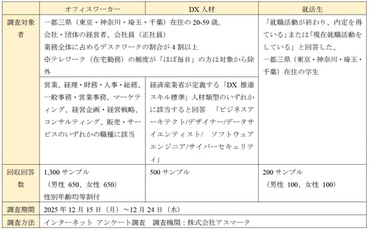 本年は、企業のDX人材確保への関心が益々高まっていることから、調査対象者にDX人材を加え、DX人材の求めるオフィス・働き方・街を調査し、一般オフィスワーカーとの比較を行っております。