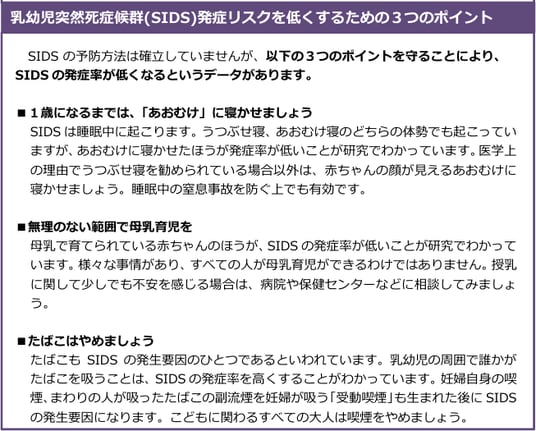 日本では、乳幼児突然死症候群(SIDS:Sudden Infant Death Syndrome)は