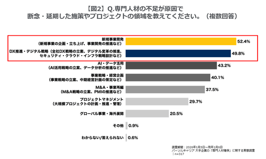 - 6割超が専門人材不足で施策やプロジェクトの断念を経験。「新規事業開発」や「DX推進・デジタル戦略」に影響- 半数以上が「専門人材の確保スピードが経営層の期待に追いついていない」と回答