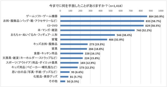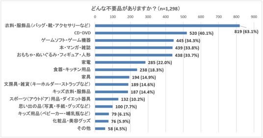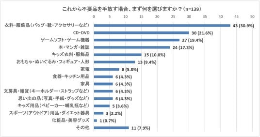 また、不要品を手放す場合に何を選ぶかについては、昨年同様、1位が「衣料・服飾品(バッグ・靴・アクセサリーなど)」、2位が「CD・DVD」という結果になりました。また、昨年4位だった「ゲームソフト・ゲーム機器」は3位に上昇しました。