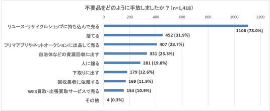 ・不要品を手放した方法は「リユースショップ・リサイクルショップに持ち込んで売る」が78.0%で
