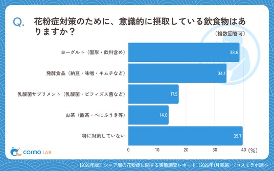 意識的に摂取している飲食物では、「特に対策していない」(39.7%)が最も高く、食習慣面での対策を特に行っていない層が、一定規模で存在することが分かりました。