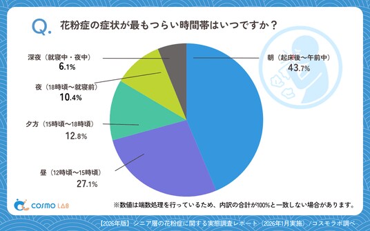 最もつらい時間帯は「朝(起床後~午前中)」(43.7%)が最多で、「昼(12時頃~15時頃)」(27.1%)が続きました。「夕方(15時頃~18時頃)」(12.8%)、「夜(18時頃~就寝前)」(10.4%)、「深夜(就寝中・夜中)」(6.1%)は相対的に低い結果となっています。