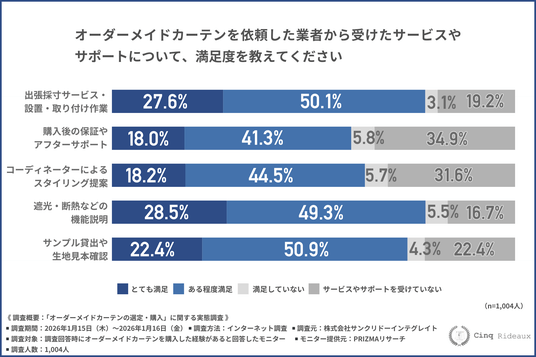 「出張採寸サービス・設置・取り付け作業」や「遮光・断熱などの機能説明」「サンプル貸出や生地見本確認」といった実務的なサービスへの満足度は高く、プロによる専門的な対応が高く評価されていることがうかがえます。