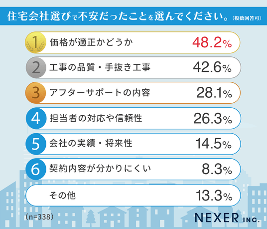 住宅会社選びで不安だったことを聞いたところ、以下のランキングとなりました。