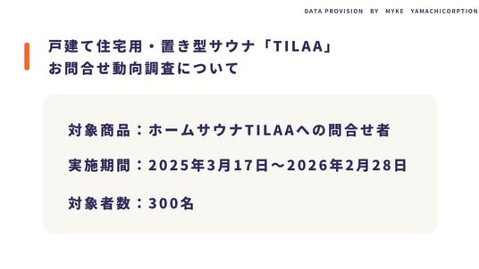 株式会社ヤマチコーポレーション(本社:北海道札幌市|代表取締役:山地章夫)のオリジナル建材ブランド「MYKE(マイク)」が展開する、戸建て用・置き型ホームサウナ「TILAA(ティラァ)」は、2026年3月で発売から1周年を迎えました。発売から1年、サウナは一時のブームを超え、健康やリフレッシュを日常に取り入れる「住まいのインフラ」へと進化を遂げています。本格的なロウリュ体験と最短半日のスピード施工を両立したTILAAは、新築・リフォーム市場において「体験という付加価値」を提案し続けてまいりました。