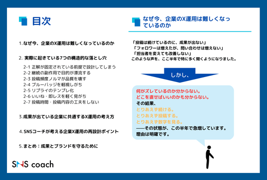 SNSコーチでは、「企業X運用の多くは、投稿テクニックではなく“運用設計”のズレによって成果が出なくなっている」と指摘しています。