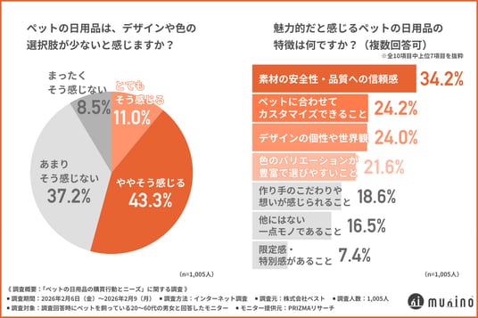 調査により、多くの飼い主がペットの日用品に対して「デザインや色の選択肢が少ない」と感じていることが明らかになりました。