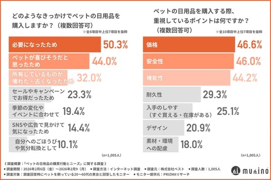 はじめに、「どのようなきっかけでペットの日用品を購入するか」と尋ねたところ、『必要になったため(50.3%)』が最も多く、『ペットが喜びそうだと思ったため(44.0%)』『所有しているものが壊れた・古くなったため(32.0%)』と続きました。