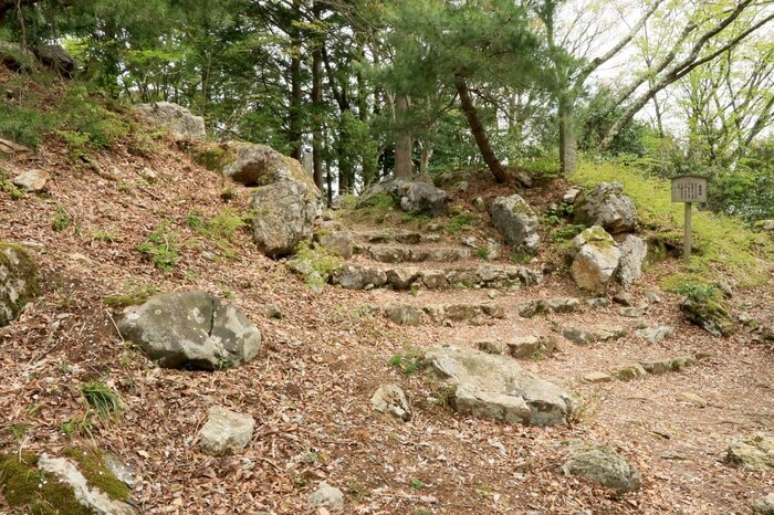 石段の両側に巨石が並ぶ黒金門ガッチリ固められた防御ラインを突破すると、いよいよ小谷城の中枢部です。