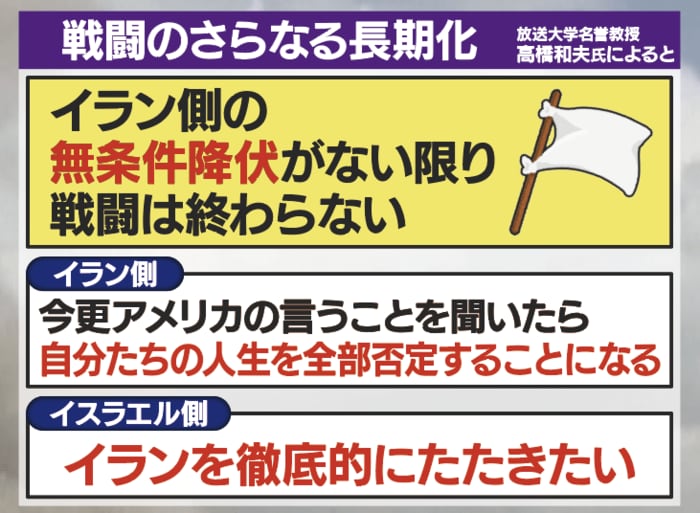 高橋氏は、今後のイラン情勢をめぐって、戦闘のさらなる長期化の可能性もあるとみているといいます。