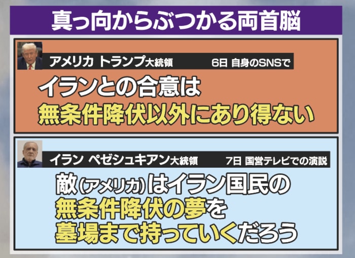 それに対し、イランのペゼシュキアン大統領は7日、「敵(アメリカ)はイラン国民の無条件降伏の夢を墓場まで持っていくだろう」と真っ向から対立の姿勢です。
