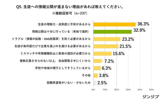 情報公開が進まない理由について、「生徒の理解力・成熟度に不安があるから」(36.3%)、「トラブルを防ぐため」(23.2%)、「生徒が条件面だけで企業を選ぶことを避けるため」(21.5%)に多く回答が集まりました。