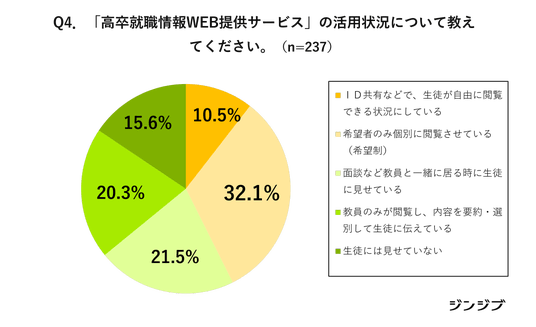 「高卒WEB」の活用状況について、生徒が自分の意思で自由に閲覧できる環境がある(「ID共有などで、生徒が自由に閲覧できる状況にしている」(10.5%)、「希望制(希望者のみ個別に閲覧させている)」(32.1%))と回答したのは、42.6%にとどまりました。先生が内容を要約して伝えているという回答も合わせて、「見せていない」の回答が35.9%でした。