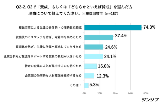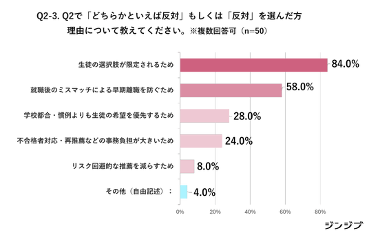 賛成の立場である教員の最も多い理由は、「複数社応募による生徒の負担を軽減するため」(74.3%)でした。反対の立場である教員では、「生徒の選択肢を狭めることへの懸念」(84%)がトップとなりました。