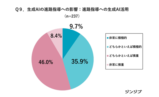 次に教員自身の進路指導の業務に対しての生成AIの影響を伺ったところ、積極的だという割合は45.6%、慎重派は54.4%でした。