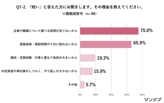 次に「短い」と回答した層(全体の37.1%)へ、短いと考える理由を聞いたところ、「企業や職種を調べる時間」(75%)や「進路指導・相談の時間」(65.9%)が短いと感じている教員が多いことがわかりました。