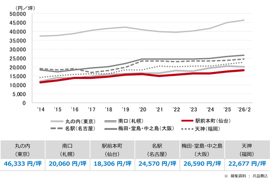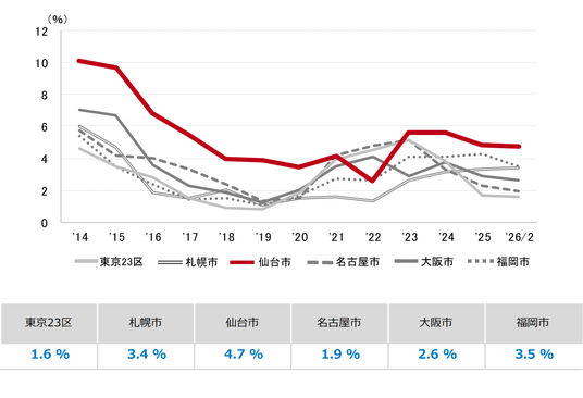 三幸エステート株式会社(本社:東京都中央区、取締役社長:福島正二郎)は、2026年2月度の仙台市オフィス賃貸状況(空室率&現空面積:全規模、募集賃料&募集面積:全規模、規模別空室率、主要エリア※1空室率:全規模)および全国6大都市(東京・札幌・仙台・名古屋・大阪・福岡)の大規模ビルのマーケットデータをまとめた「オフィスマーケット2026年3月号仙台」を公表します。