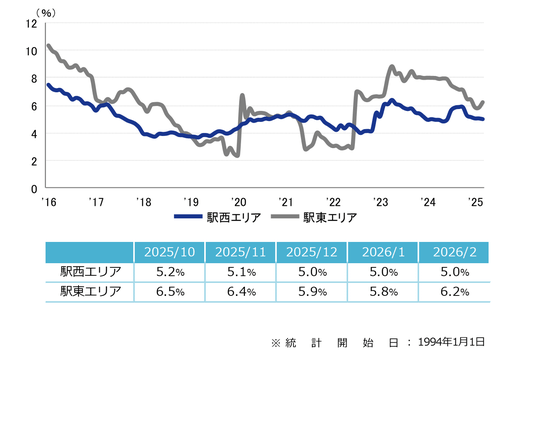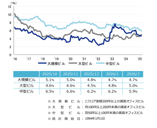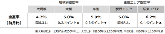 空室率は前月比マイナス0.01ポイントの5.35%となり、前月からほぼ横ばいだった。主要エリアの大規模ビルで空室が生じた一方、館内増床や拡張移転等で空室床の消化が進み、わずかな動きに止まっている。規模別では「中型」が5%台に低下し、統計開始以来の最低値を更新した。潜在空室率は前月比プラス0.23ポイントの6.99%だった。