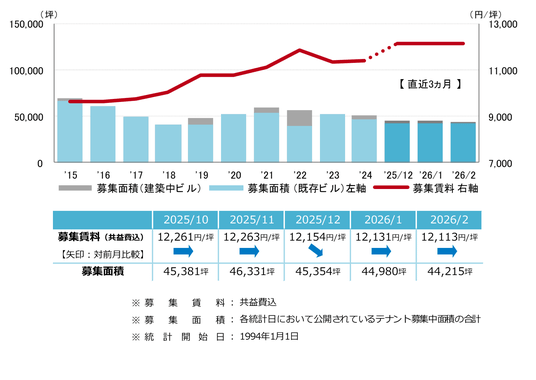 募集賃料 前月からわずかな動き 12,000円/坪台前半で横ばい