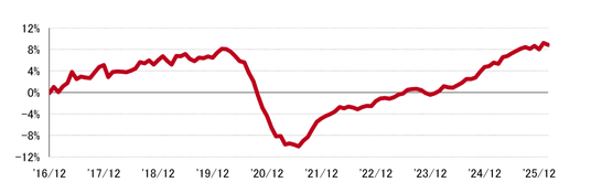 募集賃料の対前年同月比は、2024年2月から25ヵ月連続のプラスを記録している。直近4ヵ月の上昇ペースは9%前後で推移しており、コロナ禍前のピークを1ポイント近く上回っている。