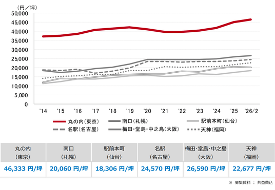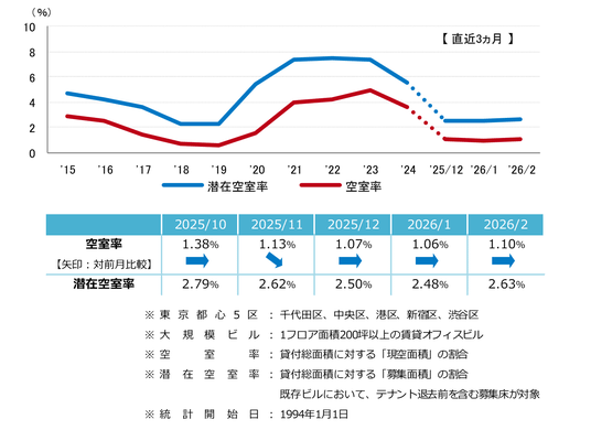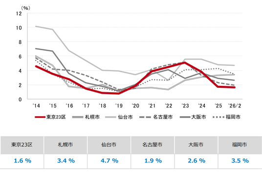 三幸エステート株式会社(本社:東京都中央区、取締役社長:福島正二郎)は、2026年2月度の東京都心5区(千代田区、中央区、港区、新宿区、渋谷区)および全国6大都市(東京、札幌、仙台、名古屋、大阪、福岡)の大規模ビル※1のマーケットデータをまとめた「オフィスマーケット2026年3月号」を公表します。