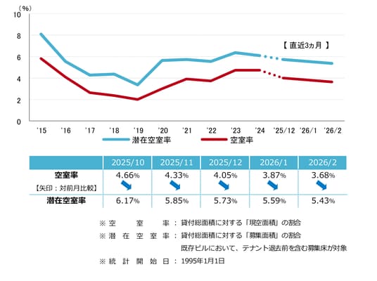 空室率は前月比マイナス0.19ポイントの3.68%となり、5ヵ月連続で低下した。新築・築浅ビルを中心に空室消化が進み、主な低下要因となっている。エリア別では「天神」が前月比マイナス0.8ポイントと大幅に低下した。潜在空室率は前月比マイナス0.16ポイントの5.43%だった。