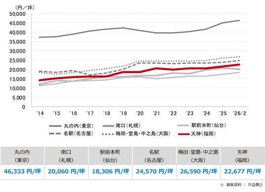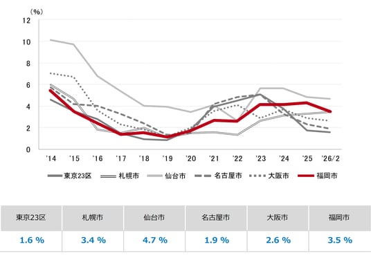 三幸エステート株式会社(本社:東京都中央区、取締役社長:福島正二郎)は、2026年2月度の福岡市オフィス賃貸状況(空室率&現空面積:全規模、募集賃料&募集面積:全規模、規模別空室率、主要エリア※1空室率:全規模)および全国6大都市(東京・札幌・仙台・名古屋・大阪・福岡)の大規模ビルのマーケットデータをまとめた「オフィスマーケット2026年3月号福岡」を公表します。