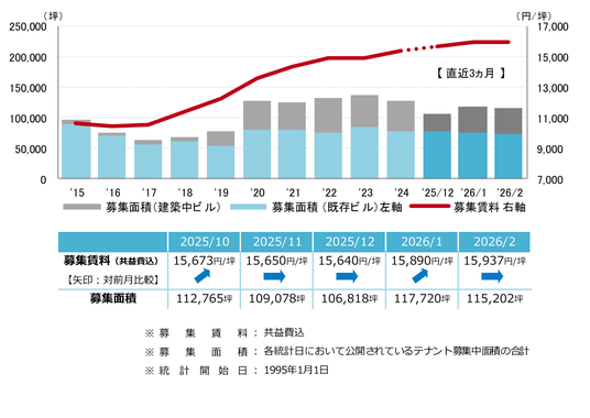 募集賃料は前月比プラス47円/坪の15,937円/坪となった。前月から小幅に上昇し、2000年以降の最高値更新が続いている。