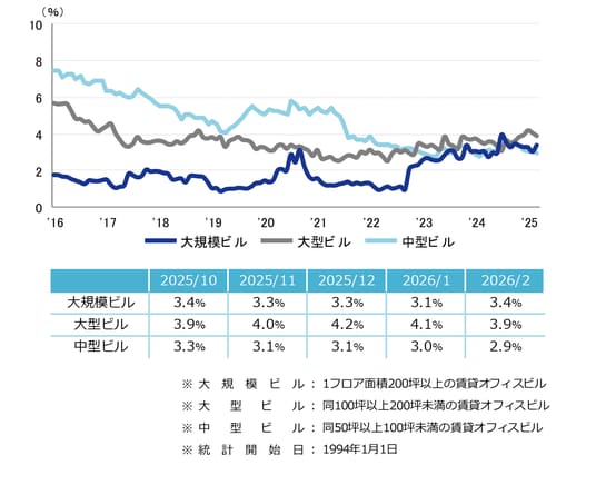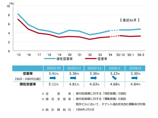 空室率は前月比プラス0.07ポイントの3.30%となり、前月から小幅に上昇した。新築ビルがまとまった面積の空室を抱えて竣工し、主な上昇要因となっている。エリア別では「南口」が前月比プラス0.8ポイントの大幅な上昇となった。潜在空室率は前月比プラス0.16ポイントの4.84%だった。