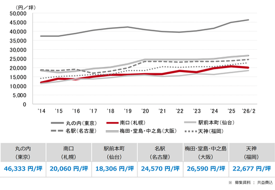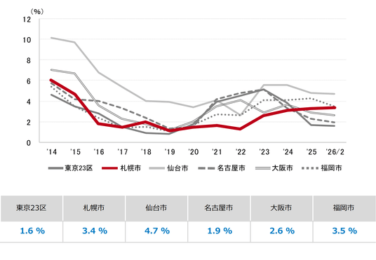 三幸エステート株式会社(本社:東京都中央区、取締役社長:福島正二郎)は、2026年2月度の札幌市オフィス賃貸状況(空室率&現空面積:全規模、募集賃料&募集面積:全規模、規模別空室率、主要エリア※1空室率:全規模)および全国6大都市(東京・札幌・仙台・名古屋・大阪・福岡)の大規模ビルのマーケットデータをまとめた「オフィスマーケット2026年3月号札幌」を公表します。