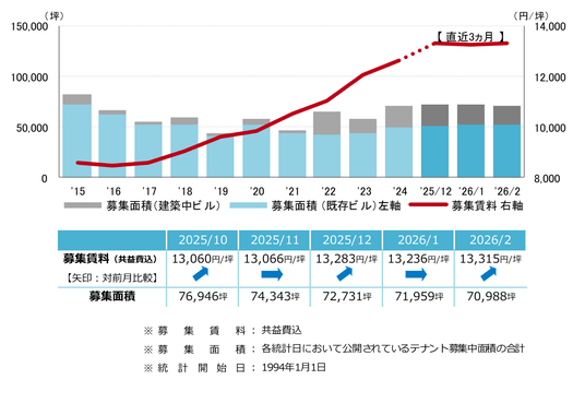 募集賃料は前月比プラス79円/坪の13,315円/坪となり、前月から上昇した。賃料は統計開始以来の最高値を更新している。