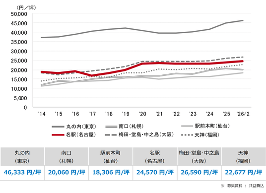 三幸エステート株式会社(本社:東京都中央区、取締役社長:福島正二郎)は、2026年2月度の名古屋市オフィス賃貸状況(空室率&現空面積:全規模、募集賃料&募集面積:全規模、規模別空室率、主要エリア※1空室率:全規模)および全国6大都市(東京・札幌・仙台・名古屋・大阪・福岡)の大規模ビルのマーケットデータをまとめた「オフィスマーケット2026年3月号名古屋」を公表します。