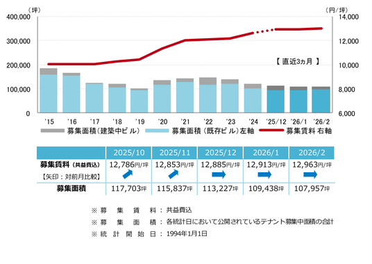 募集賃料は前月比プラス50円/坪の12,963円/坪となり、6ヵ月連続で上昇している。緩やかな上昇傾向が継続し、賃料は13,000円/坪台目前で推移している。
