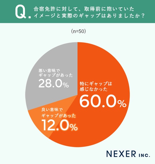 続いて、合宿免許について、取得前のイメージと実際にギャップがあったか聞いてみました。