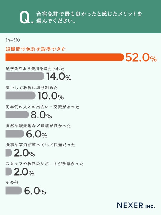 最も多かったのは「短期間で免許を取得できた」で52.0%と過半数を占めました。次いで「通学免許より費用を抑えられた」が14.0%、「集中して教習に取り組めた」が10.0%と続きます。