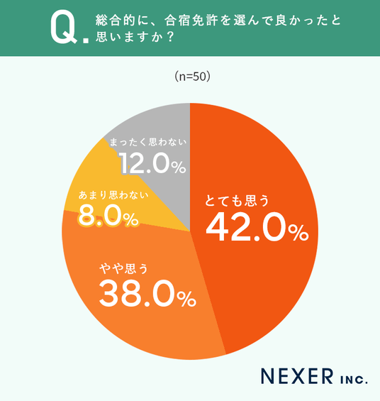 その結果「とても思う」が42.0%、「やや思う」が38.0%で、合計80.0%が合宿免許を選んで良かったと回答しました。一方「あまり思わない」は8.0%、「まったく思わない」は12.0%にとどまっています。