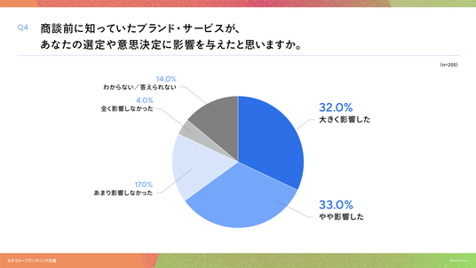 「Q4. 商談前に知っていたブランド・サービスが、あなたの選定や意思決定に影響を与えたと思いますか。」(n=200)と質問したところ「大きく影響した」が32.0%、「やや影響した」が33.0%という回答となりました。