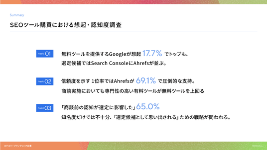 内容認知度や想起率で 無料かつ汎用的な Search Consoleを提供するGoogle が首位をとる一方で、実際に商談へ至ったブランドで Ahrefsが33.0%という高い数値を記録した点は、非常に興味深い事実です。