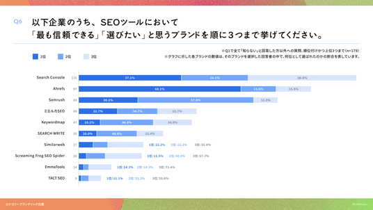 「Q6. Q1で全て「知らない」以外を回答した方にお聞きします。以下企業のうち、SEOツール領域において「最も信頼できる」「選びたい」と思うブランドを順に3つまで挙げてください(順位付けかつ上位3つまで)」(n=179)と質問したところ、回答の選出数が多い順に、1位に選ばれた割合の「1位率」はSearch Consoleが37.1%、Ahrefsが69.1%、Semrushが30.1%、という回答となりました。*なお、本調査では、回答者に対して「最も信頼できる」「選びたい」と思うブランドを、提示した9ブランドの中から最大3つまで選択し、1位から3位までの順位をつけて回答いただきました。