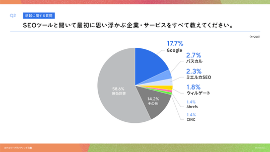 「Q2. SEOツールと聞いて最初に思い浮かぶ企業・サービスをすべて教えてください。(自由回答)」(n=200)と質問したところ、Googleが17.7%、パスカルが2.7%、ミエルカSEO(Faber Company)が2.3%という回答となりました。