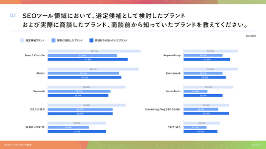 「Q3. SEOツール領域において、選定候補として検討したブランドおよび実際に商談したブランド、商談前から知っていたブランドを教えてください。」(n=200)と質問したところ、選定候補ブランドはSearch Console が43.5%、実際に商談したブランドは Ahrefs が33.0%、商談前から知っていたブランドは Search Console が37.5%という回答となりました。