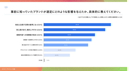 「Q5. Q4で「大きく影響した」「やや影響した」と回答した方にお聞きします。事前に知っていたブランドが選定にどのような影響を与えたか、具体的に教えてください。(複数回答)」(n=130)と質問したところ、「他社と比較する際の基準になったから」が59.2%、「安心感があり、検討しやすかったから」が54.6%、「提案内容への信頼度が高まったから」が45.4%という回答となりました。
