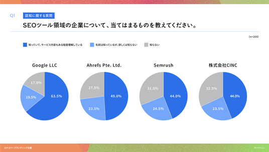 「Q1. SEOツール領域の企業について、当てはまるものを教えてください。」(n=200)と質問したところ、「知っていて、サービス内容もある程度理解している」と回答した割合は、Google LLCは63.5%、Ahrefs Pte. Ltd.が49.0%、Semrushが44.0%となりました。