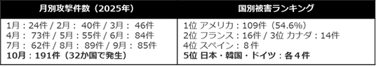 国別被害ランキングでは、日本・韓国ともに「Qilin」による被害が4件で同率5位となっています。報告書は「最近では、韓国および日本企業をターゲットとした攻撃が著しく増加している」と明記しており、両国に対する脅威の高まりは今後も注視が必要です。なお、2025年10月には単月191件と過去最多を記録しており、攻撃ペースの加速は顕著です。