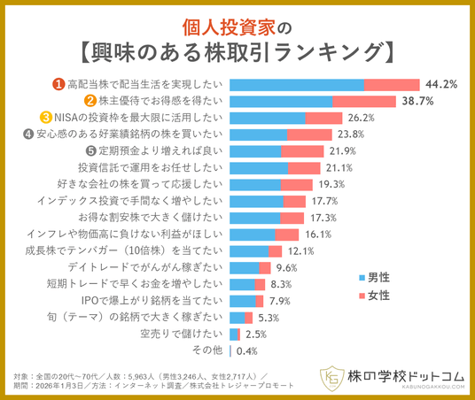 20代から70代まで幅広い層を対象に、「あなたはどんな株取引に興味がありますか?」という質問に計17の選択肢から複数回答で選んでもらったところ、最も多かったのは「株主優待でお得感を得たい」(31.91%)でした。わずかの差で2位となったのは「高配当株で配当生活を実現したい」(31.86%)で、3割を超える回答率を得たのは上位2つのみでした。続いて、3位「定期預金より増えれば良い」(29.0%)、4位「安心感のある好業績銘柄の株を買いたい」(22.0%)、5位「NISAの投資枠を最大限に活用したい」(19.5%)となりました。